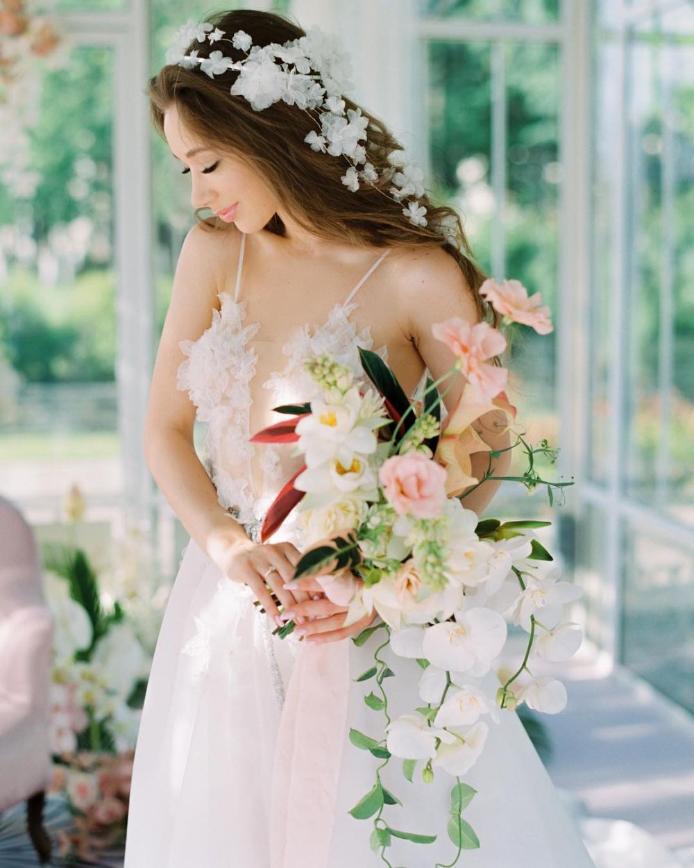 - рост девушки. Высокие девушки могут позволить себе вытянутые конструкции и длинные цветы (например, со свисающими растениями). Низким стоит аккуратно подходить к выбору таких композиций. Это может подчеркнуть небольшой рост невесты.