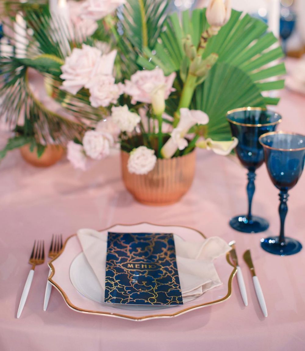 При этом Ксения отмечает, что в букетах все чаще используется крашеная зелень, которая совсем не противоречит отказу от зелени в букете. «Крашеная зелень уже как зелень не воспринимается, она становится неким необычным декоративным элементом в букете. Серебро, золото, медь, чёрный, синий — может быть использован любой цвет, который подходит под общую концепцию оформления. Обычно выбирают зелень с крупными листьями. Иногда окрашивают даже цветы, такие как антуриумы, которые способны такую процедуру выдержать. В прошедшем сезоне наша студия оформляла свадьбу, на которой мы решили полностью отказаться от зелёного цвета и всю зелень перекрасили в медный. Получилось очень стильно! И, конечно, букет невесты вторил общей стилистике.»