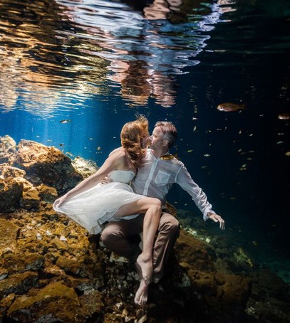 Кстати, отважишься ли ты на фотосъёмку под водой? Представь, твоё свадебное платье, шлейф и фата эффектно развеваются под водой. Вы дурачитесь, переворачиваетесь, закручиваетесь, берёте на руки, можно всё – вы же практически невесомы. Подводные фотографии, определённо, займут первые места в вашем свадебном альбоме!