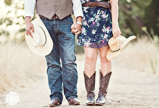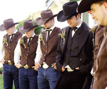 После завершения официальной церемонии свадьбы в стиле кантри жених с невестой надевают ковбойскую одежду и начинают путешествие по прериям. Для прогулки верхом подойдут более простые и удобные, но не менее эффектные наряды в стиле вестерн. Жених может позволить себе джинсы и ремень с большой металлической пряжкой, ковбойские сапоги-ботфорты с торчащими кверху носами, клетчатую рубашку, кожаную жилетку, широкополую шляпу. Дополнят образ кобура с кольтом и переброшенное через плечо лассо.