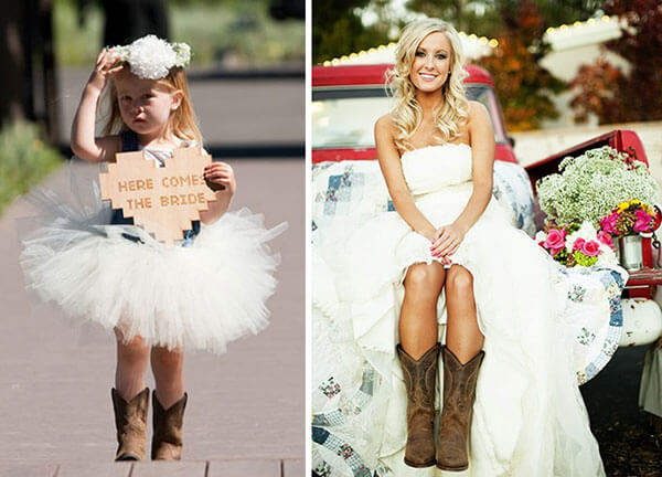 Если невеста выбрала классическое платье, можно накинуть поверх него джинсовую или кожаную куртку, или же рубашку в клетку, повязав ее на талии. Можно надеть вместо классических туфлей на шпильке, совершенно неуместных на свадьбе в стиле кантри, ковбойские сапоги белого, бежевого или коричневого цвета.
