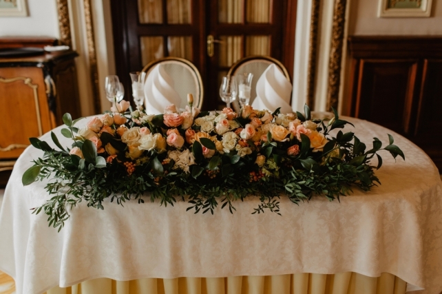 - Как украшены столы, какие цветы и вазы для них подобраны: чем тщательнее составлены цветочные композиции, тем меньше вероятность, что их пыльца или лепестки попадут в еду или питьё гостей.