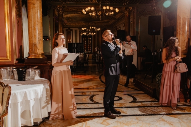 Следующий шаг — выбор ведущего. А его выбрать надо. Какими бы веселыми не были ваши гости, они не смогут развлекать себя весь вечер. Особенно если у вас их много. Наши требования были такими: остроумный и способный разрядить обстановку ведущий должен чувствовать, когда пора остановиться. Бесчисленные крики «горько», шампанское из туфли, стягивание подвязки зубами и пошлые игры были не для нас. Хорошие ведущие берут в среднем 60-100 тыс. рублей за 6-7 часов работы (этого времени многим, кстати, не хватило). Мы нашли классного ведущего, заключили договор, продумали конкурсы, а за неделю до свадьбы ведущий отвалился. Вот так. У него возникли личные проблемы (с кем не бывает), и он предложил нам замену. Мы приняли и этот вызов и снова не прогадали. Саша, наверное, подошел нам даже больше. За неделю он выложился на 100%, выучил почти все имена гостей, привез диджея, свет, тяжелый дым и ненадоедливые шутки. Ведущего можно найти через специальное агентство, но лучше обратиться к знакомым, которые уже знают человека в лицо. Сашу мы рекомендуем.