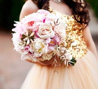 - Букет невесты. Пожалуй, это одна из основных деталей свадебного образа девушки. В букет можно вставить такие цветы, которые будут сочетаться с темой свадьбы. Можно использовать цветы любого цвета, сочетающегося с золотым, но украсить их золотыми лентами, блестками, бусинками. Даже сами цветы могут быть обработаны специальной краской с золотым напылением.