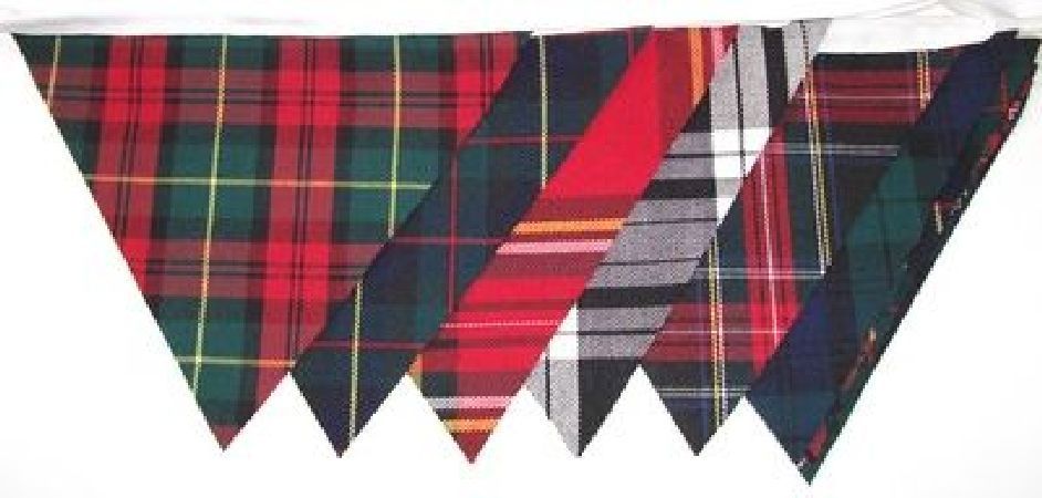 - из любой перечисленной атрибутики легко собрать гирлянды: нарезать бумагу/обои подходящего цвета ромбами, сложить, склеить треугольники на нитке и вклеить в центр изображения. В гирлянды можно собрать бумажные цветы чертополоха, ленточки клетчатой ткани, флаги, гербы, килты.