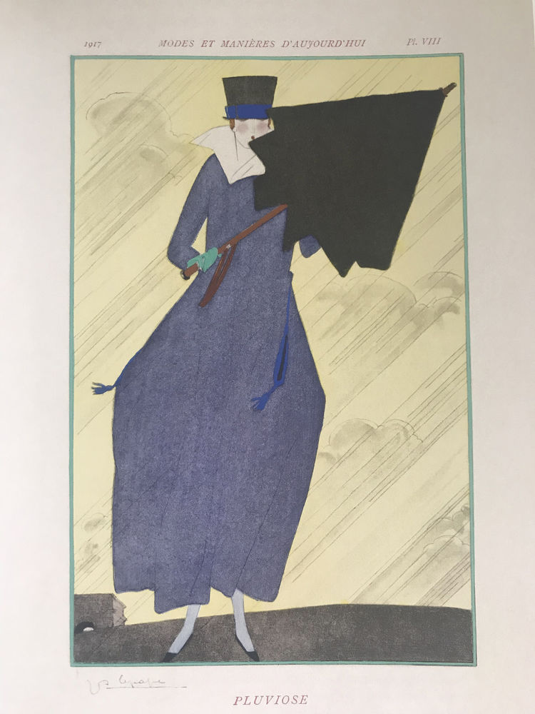 Модная иллюстрация «Плювиоз» (дождливый — пятый месяц республиканского календаря 20-21 января – 18-19 февраля) Modes et manieres d’aujourd’hui 1914-1919 Париж. художник Жорж Лепар.