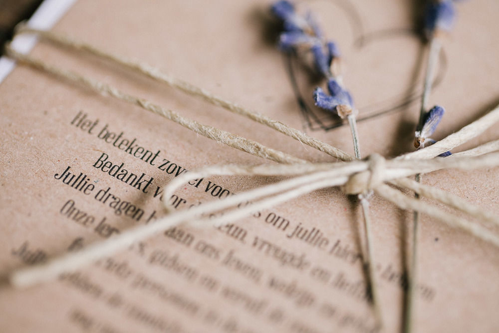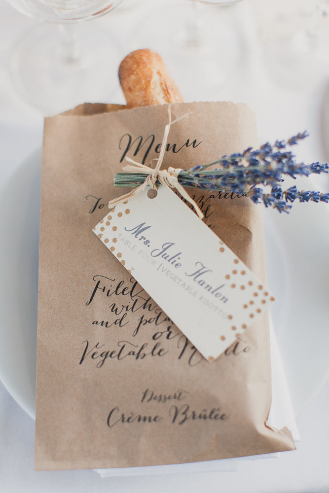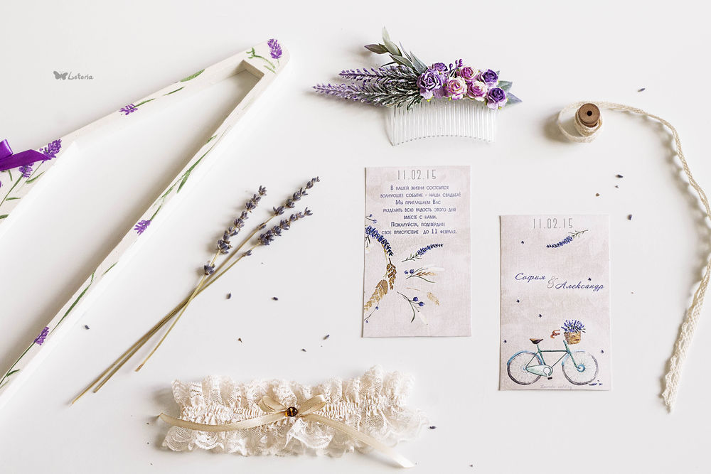 Уместно использовать веточки лаванды в качестве визитной карточки торжества, а также кружевные ленты, льняные перевязки и крафт. Лучше всего использовать шрифт, имитирующий рукописный текст, или винтажный шрифт.