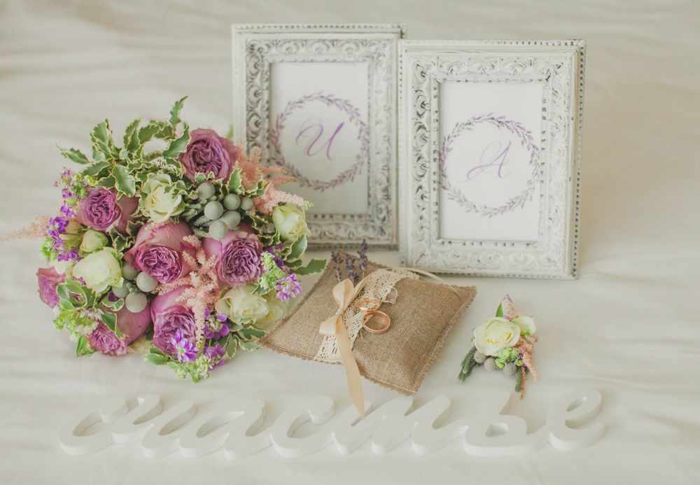 Букет невесты обязательно должен состоять не из классических роз или лилий, а из полевых цветов. Идеально подойдет лаванда, а также фиалка или гортензии. В букет можно добавить травы и сухоцветы. В целом, подойдут любые полевые цветы, сочетающиеся по цвету с платьем невесты. От чего придется отказаться, так это от пышных и вычурных композиций, ведь главный лейт-мотив свадьбы в стиле Прованс – это естественность и изысканная простота.