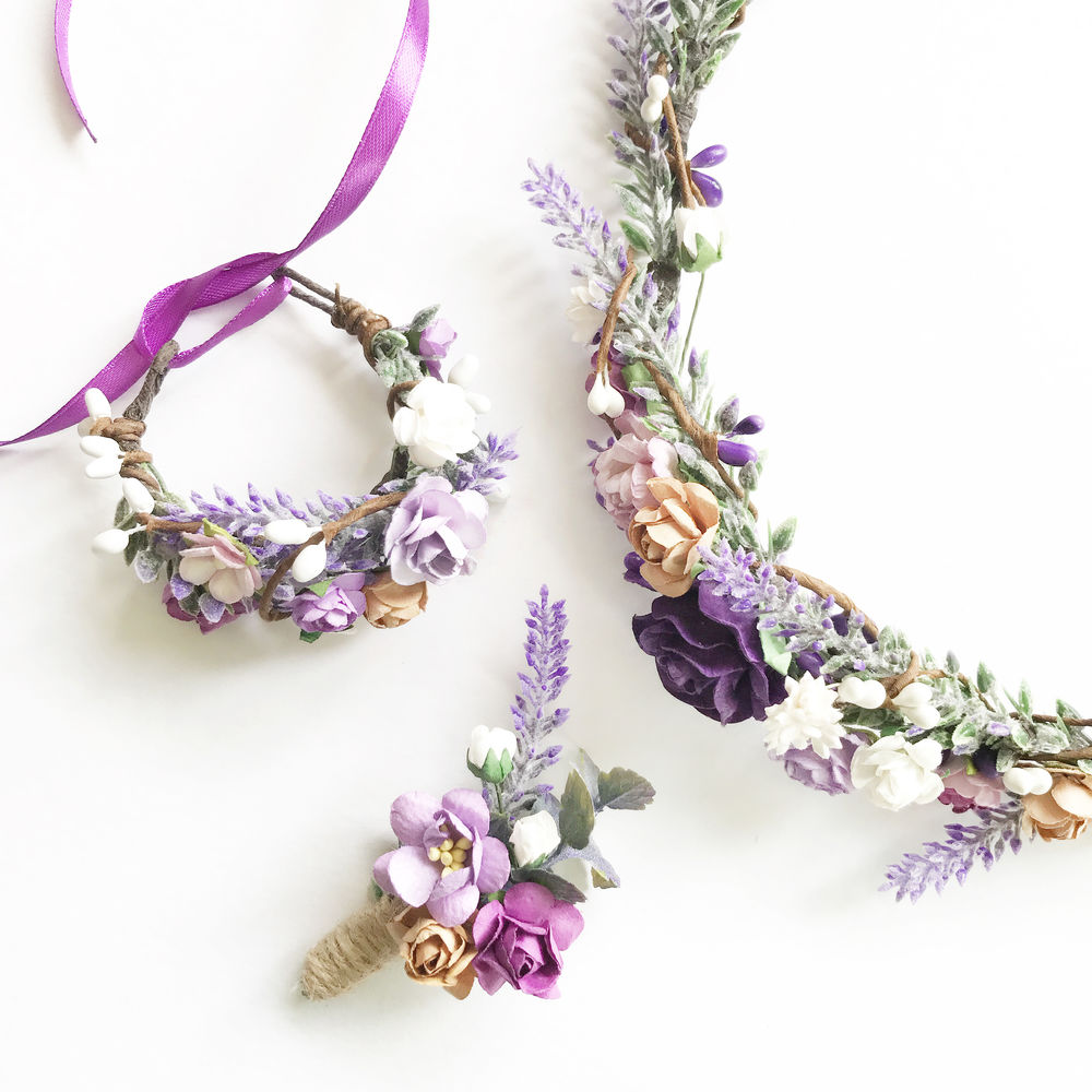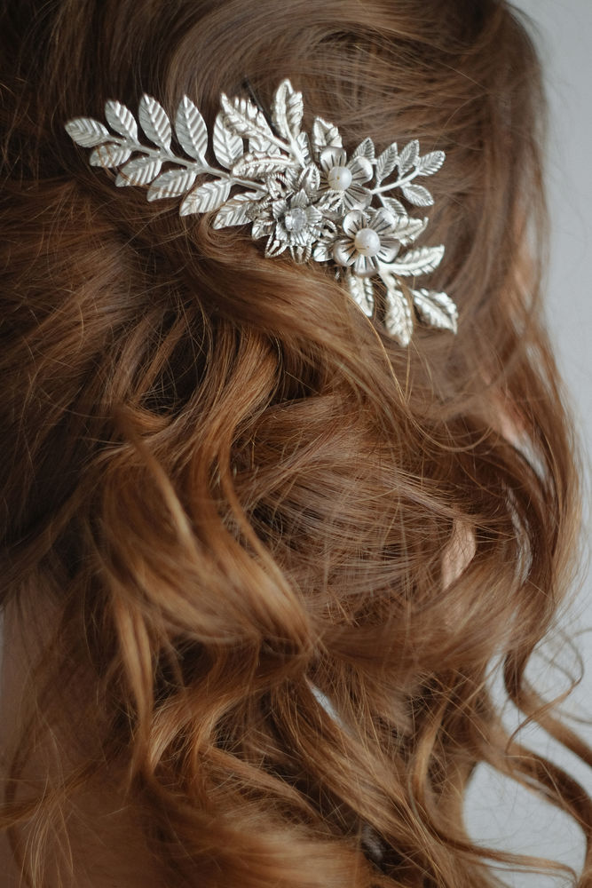 Украшения для прически, как и весь образ, должны быть легкими и лаконичными, идеально подойдут цветочные веночки и веточки для прически, гребни с лавандой, проволочные украшения с листьями и цветами в винтажном стиле.