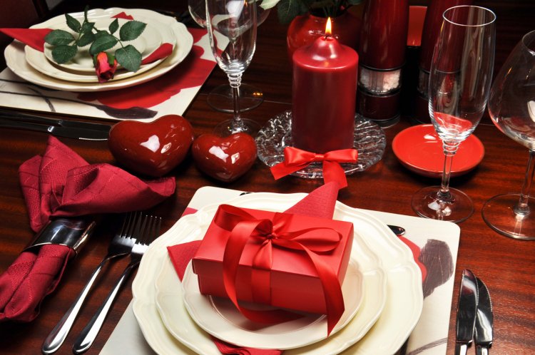 Символичный цвет праздника – красный, поэтому он обязателен в оформлении помещения. Для этого можно использовать скатерть или посуду соответствующего оттенка, цветы, свечи, подсвечники, вазы и прочую атрибутику.