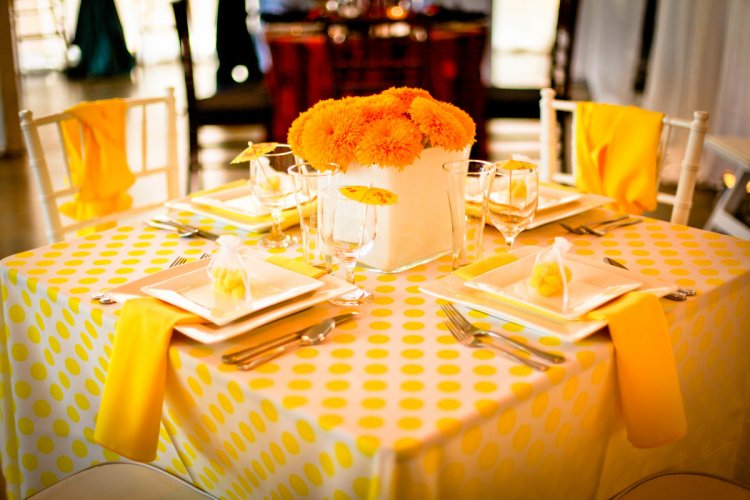 Гостям можно также подобрать подарок, который будет украшать быт супругов – это могут быть постельные принадлежности, скатерти, наволочки, декоративные подушки, и т.д. Естественно, что все эти вещи должны быть в оттенках желтого. Приятным напоминанием о прошедшем празднике могут стать комнатные растения с желтыми цветами в маленьких горшках.