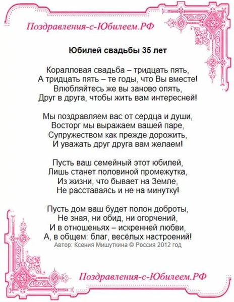 После стольких совместно прожитых лет, какая семейная пара откажется от позитивных эмоций в 35-ю годовщину свадьбы. Поэтому, многим новобрачным будет приятно услышать поздравления от людей, которые присутствовали на празднике в честь первого дня их свадьбы. Хорошая идея украсить дом плакатами с красивыми пожеланиями. Также можете заказать книгу пожеланий в кожаном переплете. В ней соберите теплые слова от друзей и родных, украсив страницы фотографиями, рисунками. Кроме того на 35 годовщине свадьбы должны звучать оригинальные поздравления. Их можно выразить в устной форме или написать на открытке. Давней традицией считается способ выражать свои мысли и чувства в стихотворной форме.