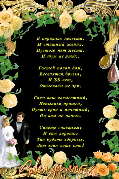 Сегодня мы собрались, чтобы отметить 35 лет со дня вашей свадьбы. Вашим детям уже за 30, а вы все так же молоды, прекрасны и любимы друг другом, как и много лет назад. Пусть же в вашей жизни будет меньше слез и больше улыбок, много любви и еще больше счастья. Горько!