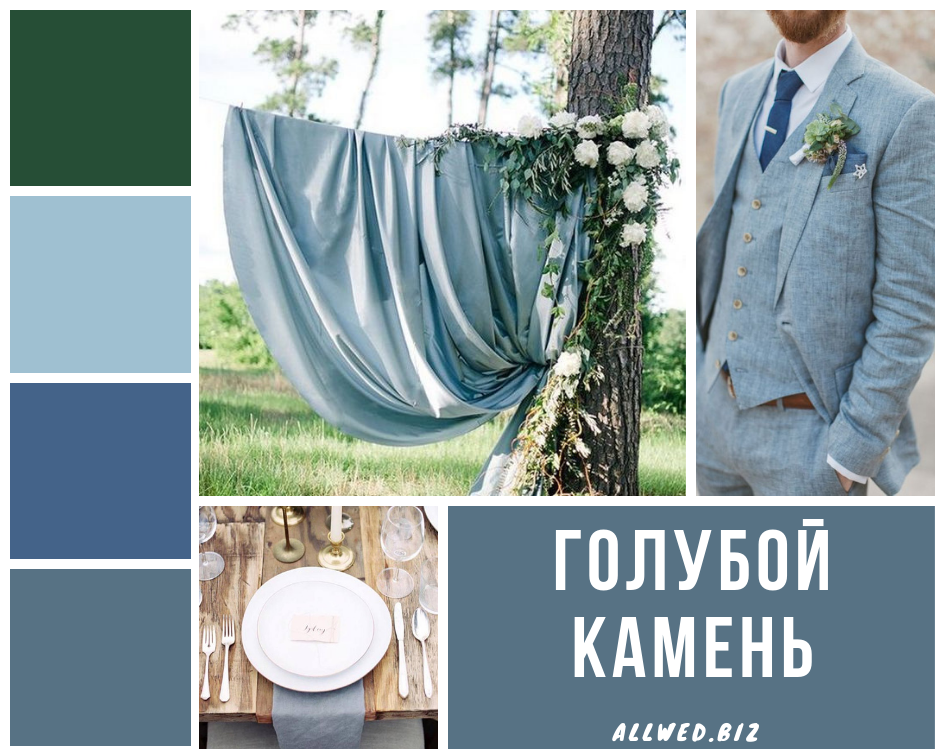 Голубой камень (Bluestone). Очень необычный и красивый оттенок зеленовато-синего. Он будет прекрасно смотреться как главным цветом свадьбы, так и чудесно подчеркнет другие, например, галактический синий.