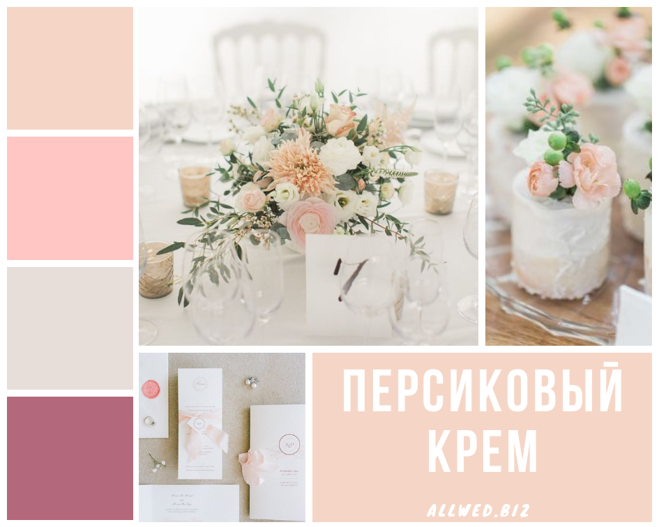 - Кремовый персиковый. Довольно нежный и теплый цвет, при этом вполне самобытный, освежающий, который так полюбили свадебные дизайнеры и декораторы. Персиковые платья подружек невесты будут замечательно смотреться на торжестве, особенно с учетом того, что оттенок помогает освежить тон кожи и подчеркнуть молодость. Хорошо сочетается с кремовым тонами, цветом брызг шампанского и нежным травяным.
