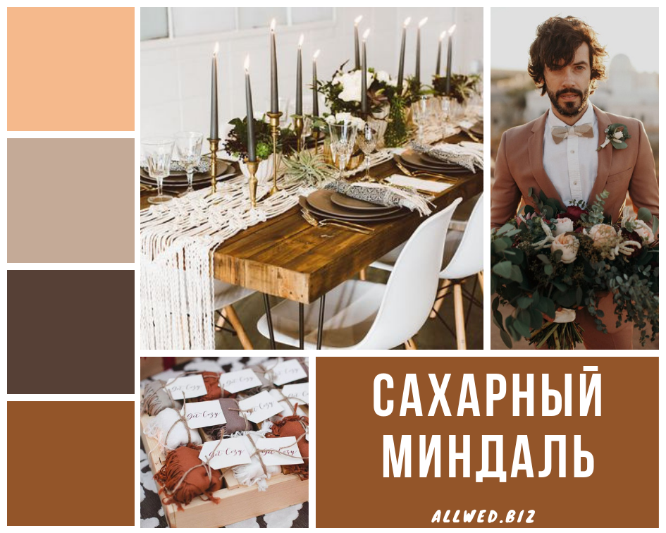 Сахарный миндаль (Sugar Almond). Еще один коричневый оттенок в палитре «Осень-зима 2020-2020». Вкусный и карамельный коричневый прекрасно подойдет для любого стиля свадьбы: от классики до индустриального.