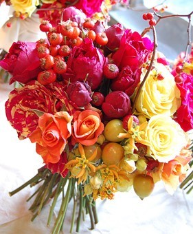 Осенью букеты невест чаще всего состоят их роз, орхидей, а также осенних цветов – хризантем, георгин, гладиолусов и даже подсолнухов. А украшением и дополнением к букету могут стать ягоды красной рябины или шиповника, виноградная лоза или райские яблочки.