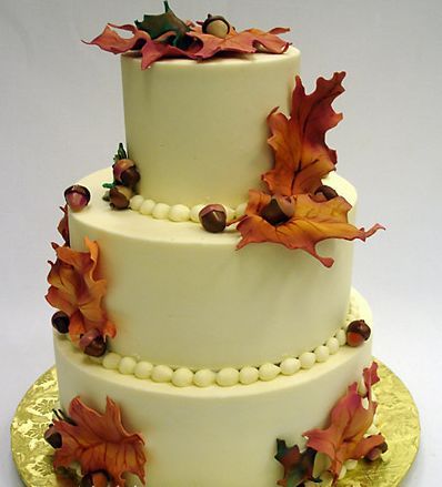 Все элементы свадьбы должны быть выдержаны в едином стиле. Это касается и торта. Украсить главное свадебное лакомство могут марципановые жёлуди и шоколадные листья.