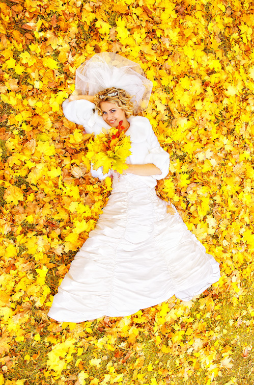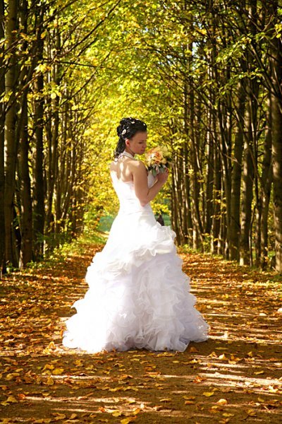 Осень – время, когда невеста может выбирать платье из всего многообразия предлагаемых цветов. Например,невесты которым хотелось бы отойти от традиции белоснежного свадебного платья, осенью могут с лёгким сердцем предпочесть наряд цвета шампанского. Кремовое платье будет особенно выигрышно смотреться в сочетании с яркими аксессуарами или красочным букетом. Любительницы тёмных, глубоких тонов, ликуйте: «осенней невесте» дозволено блистать на свадьбе в золотистом, шоколадном и бордовом.