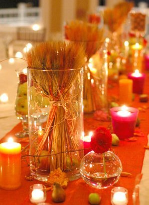 Освещением могут послужить оригинальные настольные фонарики в форме желудей или яблок. Из подручных средств можно смастерить множество креативных подсвечников. Например, обычные разноцветные стаканы, обвязанные листиками и пучками цветов, или широкие чаши с плавучими свечами. Из тыкв получаются прекрасные светильники и емкости для сладостей. И конечно же, столы должны быть богато украшены овощами и фруктами.