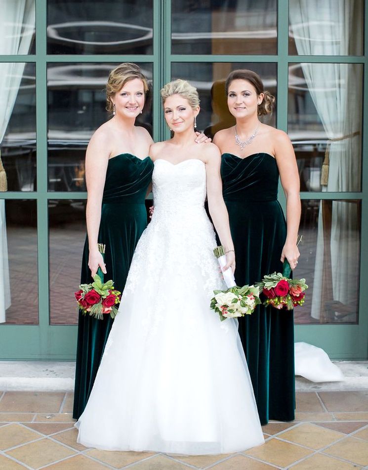 Если ищете темное платье для осеннего торжества, выбирайте бархатное. Кажется, что это слишком смело? Присмотритесь к роскошным бархатным туфлям, ленте в букете или даже подвязке. Предложите платья из этой ткани подружкам, многим она идет.