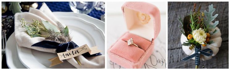 Самое простое решение – коробочки для колец, но это не все. Посмотрите на бархатные ленты, которыми перевязывают приглашения или даже бархатные вкладки в конверты.