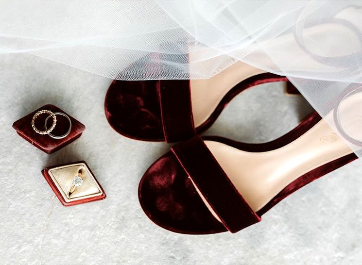 Бархат в образе невесты может присутствовать в виде самых разнообразных деталей: декоративной отделки платья — например, цветного пояса, кардигана, обуви с бархатной фактурой, украшений в прическу или клатча.